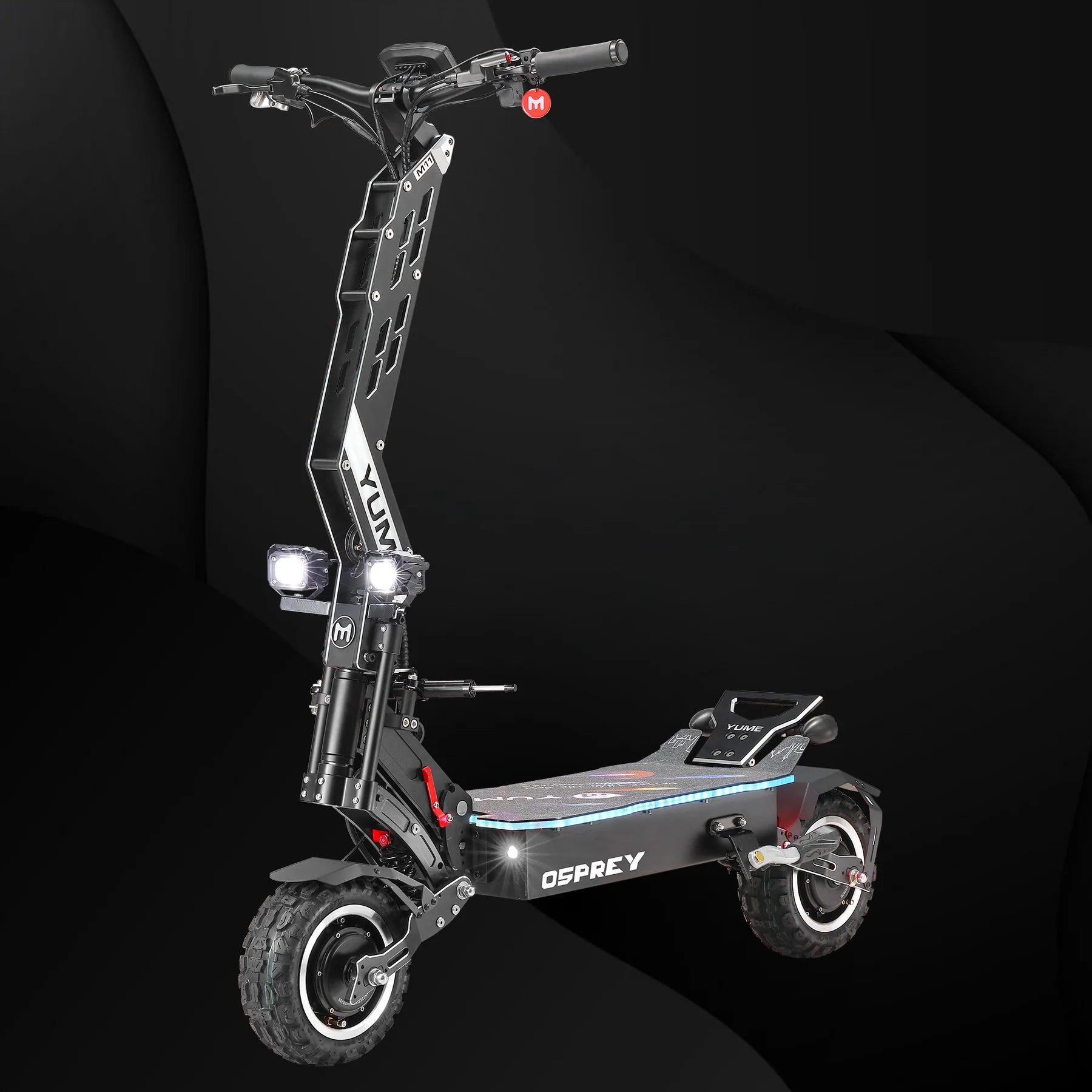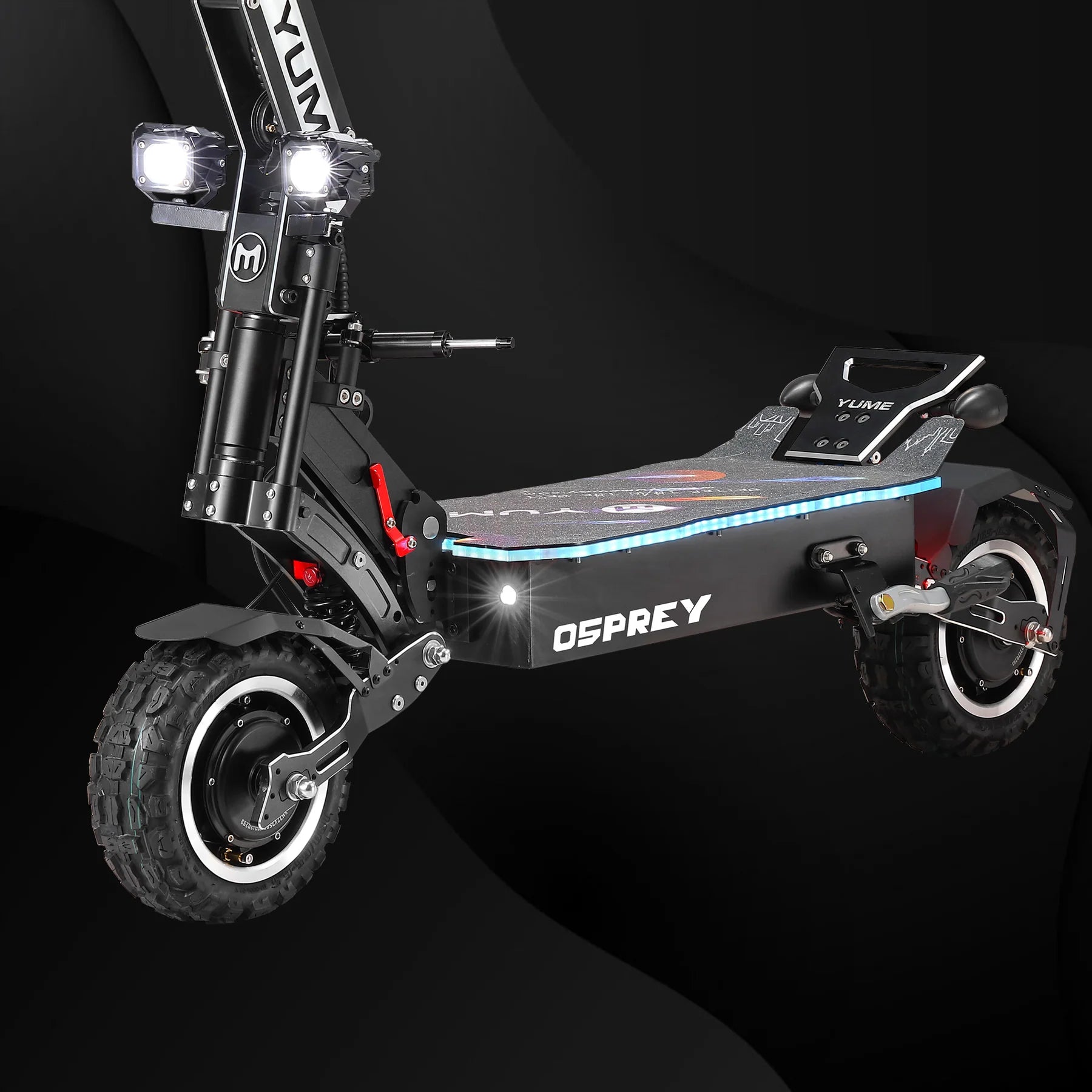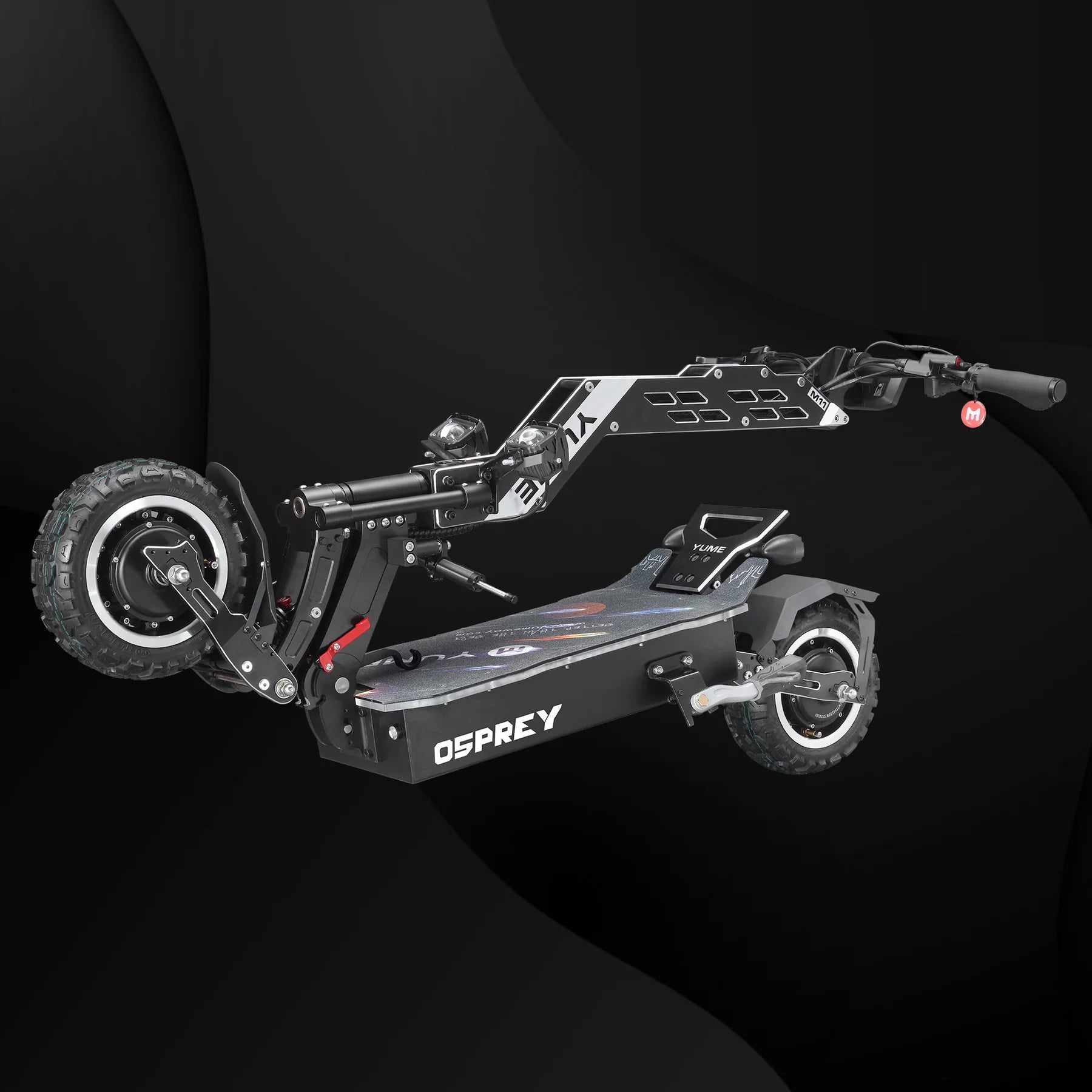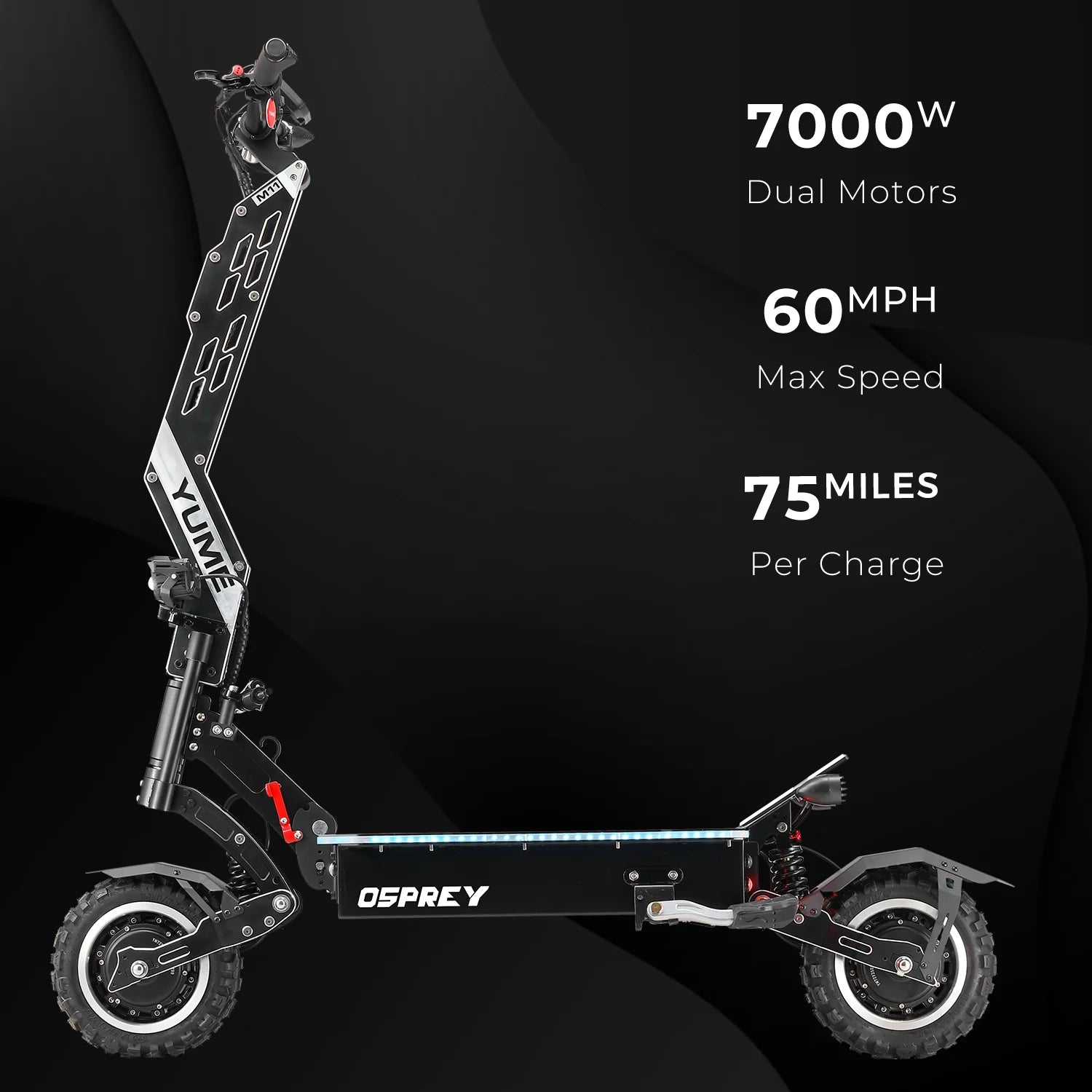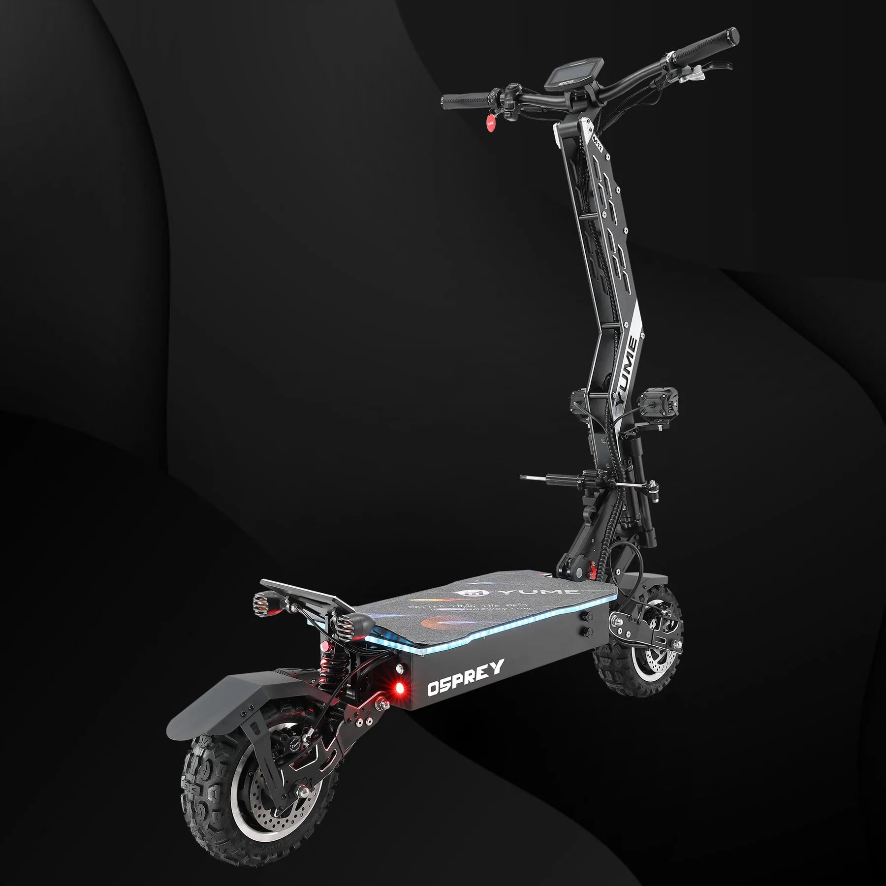 The YUME Osprey Electric Scooter is a flagship powerhouse built for riders who demand speed, range, and rugged versatility. With dual 3500W brushless motors delivering a peak output of 10,080W, the Osprey hits speeds of up to 60 mph and climbs inclines up to 45° with ease. Choose between a 72V 36Ah standard battery or a 72V 40Ah Samsung battery, offering up to 100 miles of range on a single charge.
