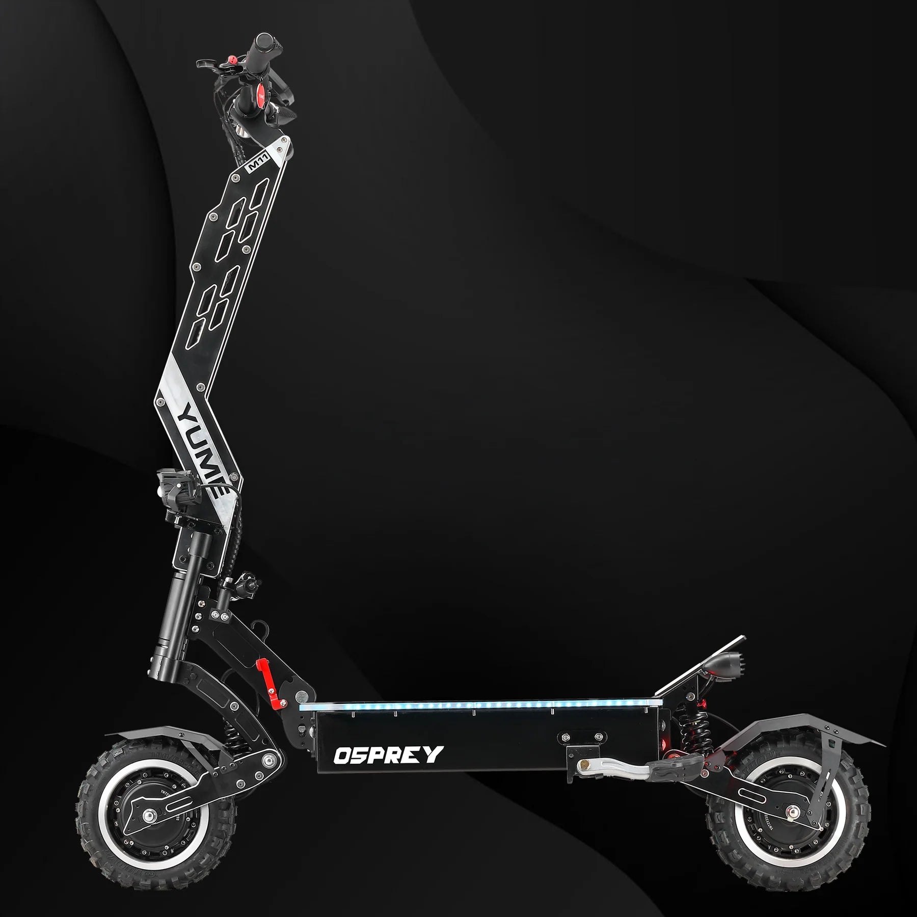 Designed for both urban and off-road adventures, the Osprey features 11" x 3.95" tubeless all-terrain tires, dual ZOOM hydraulic disc brakes, and a 10-level adjustable hydraulic suspension system for superior ride comfort. The full-color LCD display with Bluetooth and NFC unlock provides real-time performance data and app integration. With IP54 water resistance, dual throttle options, and a reinforced aviation-grade aluminum frame, the Osprey is built for serious riders who crave control, customization, and raw power.